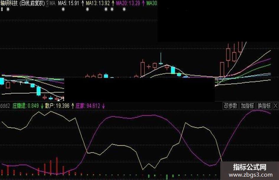 以前炒股,有个老师跟我说,跟着庄做才挣钱,后来我就找指标啊,各种找,后来找到一个,经过使用,还在用的一个显示庄散关系的指标,但是我其实就是看趋势 ,比较傻瓜的庄线上穿散线就买,相反卖,源码分享给大家,不是原创,在这谢谢原创老师,大家要是还有好用法就回帖提出来啦。