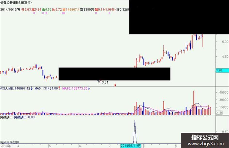 突破缺口:CROSS(C,缺口) AND (C-REF(C,1))/REF(C,1)*100>5 AND DYNAINFO(4)>0;