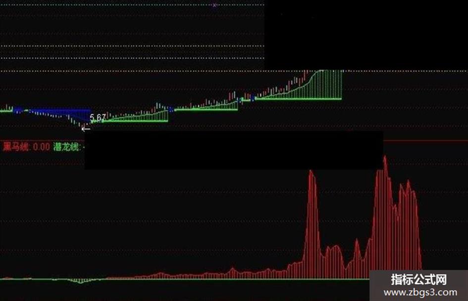 BAR1:=EMA(CLOSE,2)-EMA(CLOSE,150); BAR2:=EMA(BAR1,100); BAR3:=2*(BAR1-BAR2); BAR4:=POW(BAR3,3)*0.1+POW(BAR3,1); 黑码线:IF(BAR3>0.1,BAR4,0)*10,LINESTICK,COLORRED; 潜龙线:IF(BAR3<=0.1,BAR4,0)*10,LINESTICK,COLORGREEN;