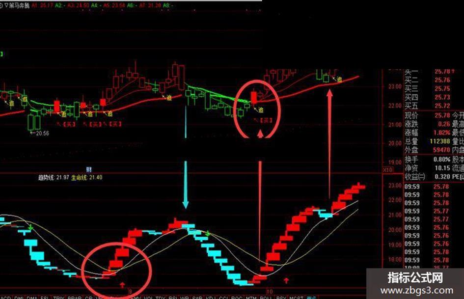 幅图指标使用趋势线和生命线交叉确定买入和卖出的操作,并用红色和蓝色台阶辅助确定操作时间。 指标使用简介:1,买入:当出现第一根红柱时可少量买入,当趋势线上穿生命线时加仓买入,只要趋势线大于生命线并一路红柱,就一直持有; 2,卖出:当出现第一根蓝柱时可半仓卖出,当趋势线下穿生命线时清仓观望。只要趋势线小于生命线并一路蓝柱,就一直观望。 3,特别强调,指标绿色向下箭头(卖出信号)迟后,当红柱走平时就可以减仓或清仓。指标有不妥的地方,烦请大家改进和优化。