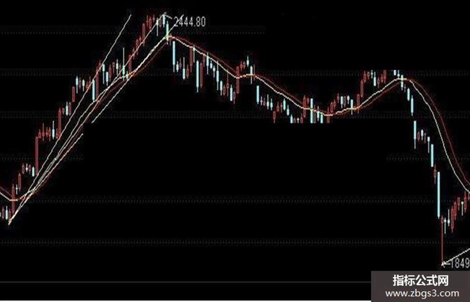 {指标说明:黄色线上穿红色线为下降趋势转入上升趋势中..另外这两根智能辅助线也可为支撑线.破线.后势看跌!}