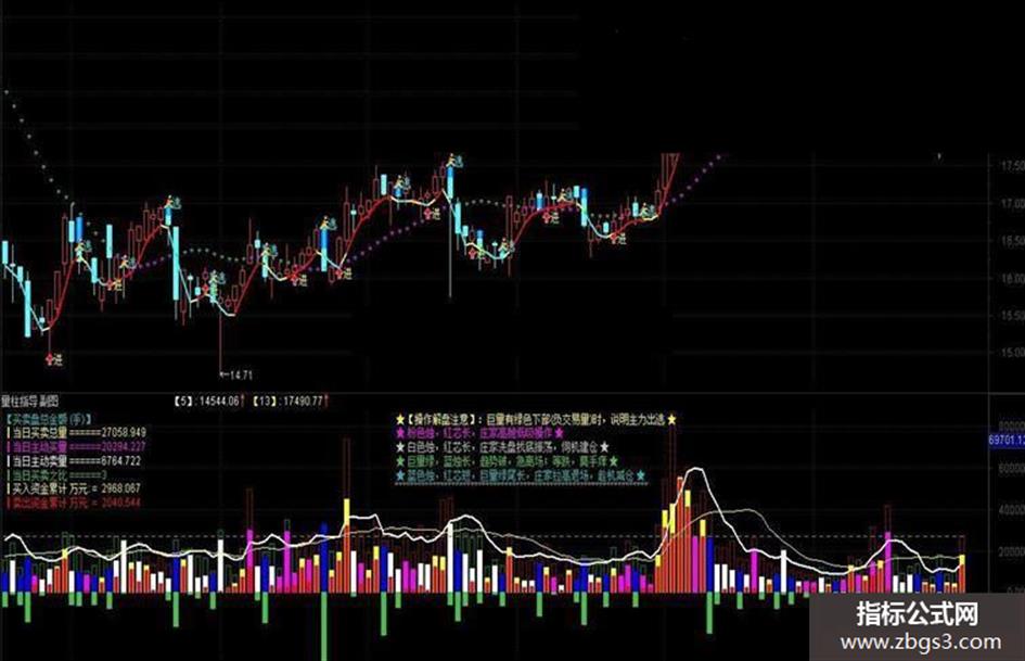 DRAWTEXT_FIX(1,0.399,0.001,0,'★【操作解盘注意】:巨量有绿色下部(负交易量)时,说明主力出逃 ★'),COLORYELLOW;