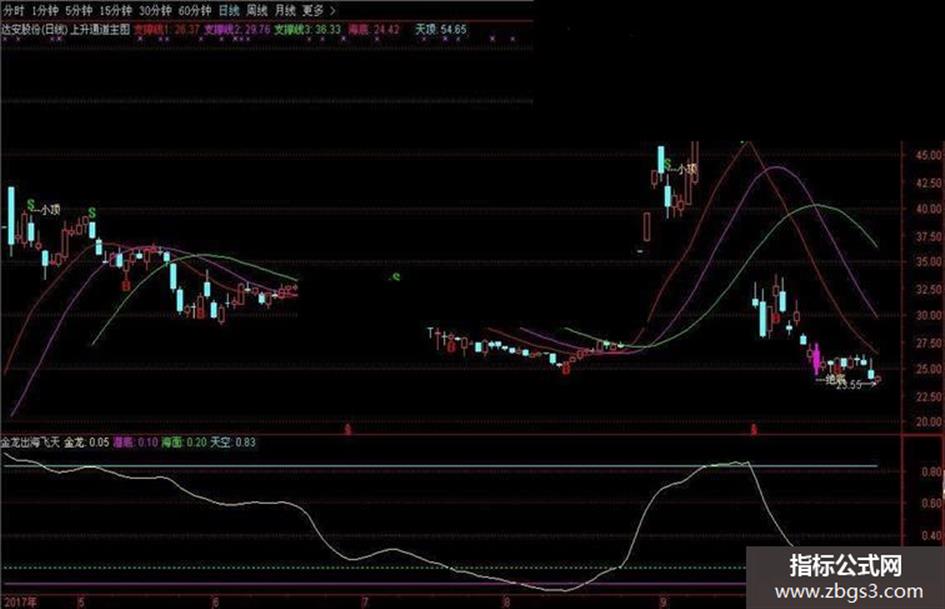 VAR1:=LLV(L,50); VAR2:=HHV(H,50); VAR3:=EMA(C,2); 金龙:EMA((VAR3-VAR1)/(VAR2-VAR1),8)COLORYELLOW; 潜底:0.1,COLORMAGENTA; 海面:0.2,COLORGREEN,DOTLINE; 天空:0.83,COLORCYAN;
