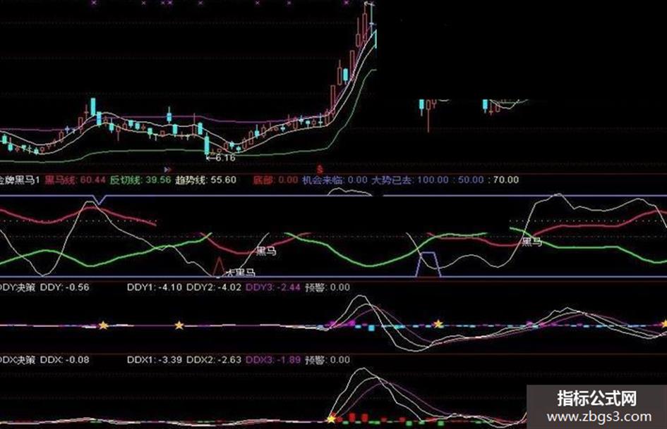 大势已去:IF(CROSS(黑马线,A1) AND 黑马线>70 AND 趋势线>80,90,100),LINETHICK2,COLORE66878;