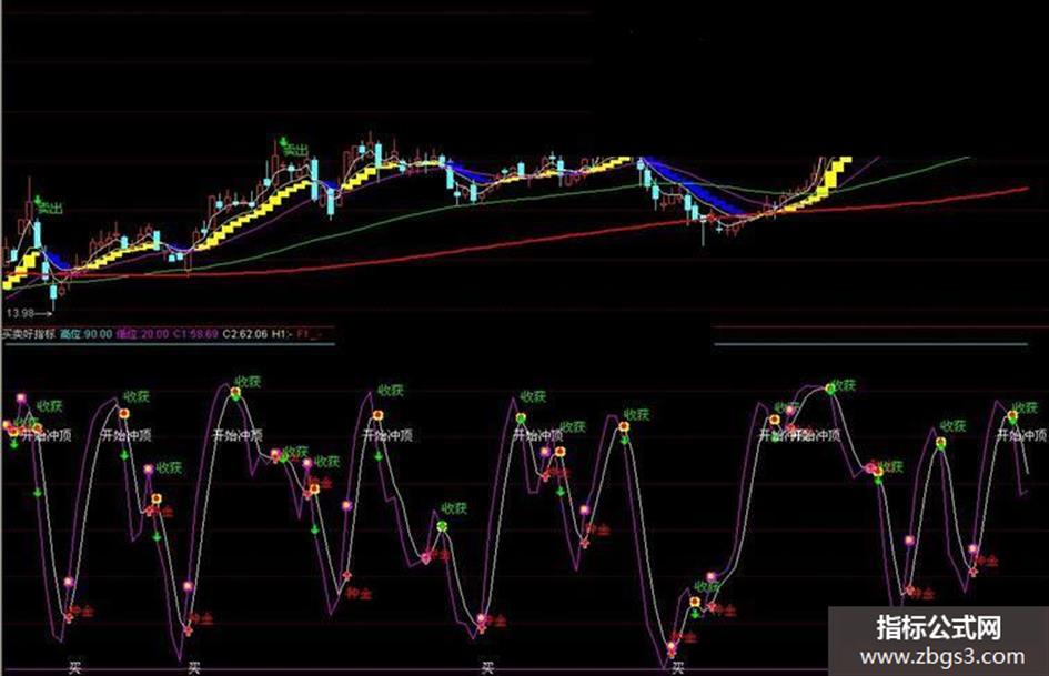 DRAWTEXT(CROSS(C2,C1),REF(C1,1),'收获'),COLORGREEN;