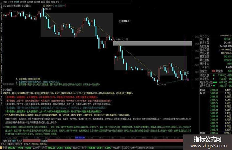 DRAWTEXT_FIX(1,0.001,0.001,0,'研判方法:前15分钟3根蜡烛 (每5分钟一根) 对全天的影响占70%,其后15分钟1根蜡烛 (9:45---10:00) 对全天的影响占30%。前后相加共4根蜡烛,可预测全天行情趋势。'),COLORYELLOW;