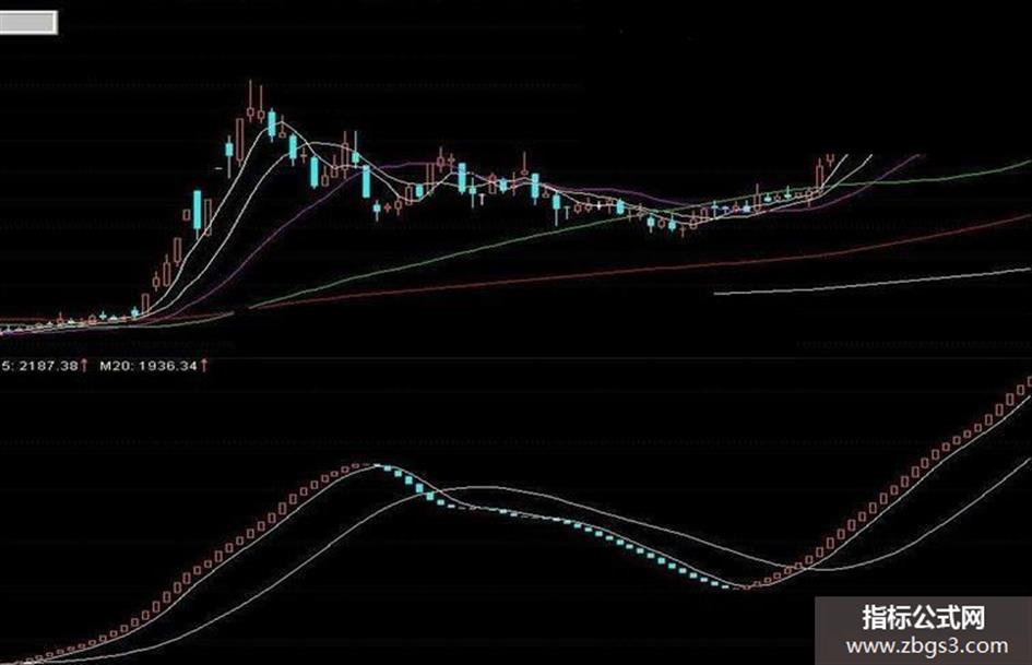 A1:=100*(WINNER(MA(C,5))-WINNER(MA(C,20))); A2:=SUM(A1,0); M5:MA(A2,5); M20:MA(A2,20); DRAWKLINE(A2,REF(A2,1),REF(A2,1),A2);