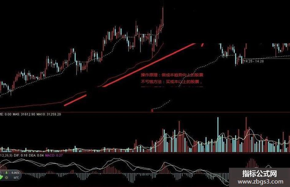 底部:=(COST(95)-COST(5))/(COST(95)+COST(5))*100; 底部成本价:COST(底部),DOTLINE,COLORYELLOW; 顶部:=100-(COST(95)-COST(5))/(COST(95)+COST(5))*100; 顶部成本价:COST(顶部),DOTLINE,COLORWHITE; 均值:=(底部+顶部)/2; 均值成本:COST(均值),COLORRED;