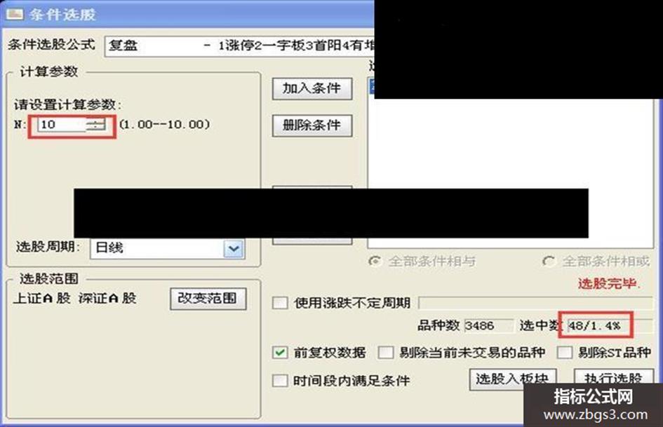 二、先用参数10把5种都选出来看看量多不多,多的话就选其中自己看中的分项选,今天我选了一下,是48只,占全部股票的1.4%;
