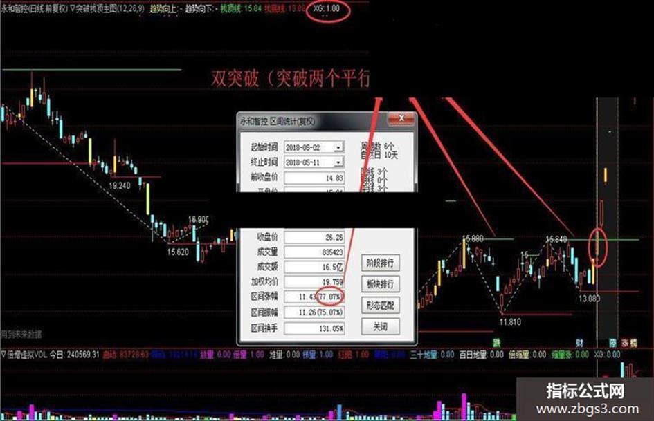 趋势向上:DRAWLINE(UU,L,NN,H,0),COLORYELLOW,DOTLINE;
