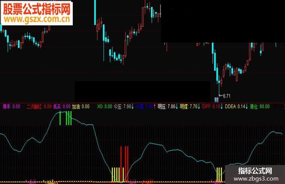 清仓:IF(趋线1>=90 AND VAR2<0,100,80),STICK,LINETHICK3,COLOR00FF00;80,STICK,LINETHICK3,COLOR000000;