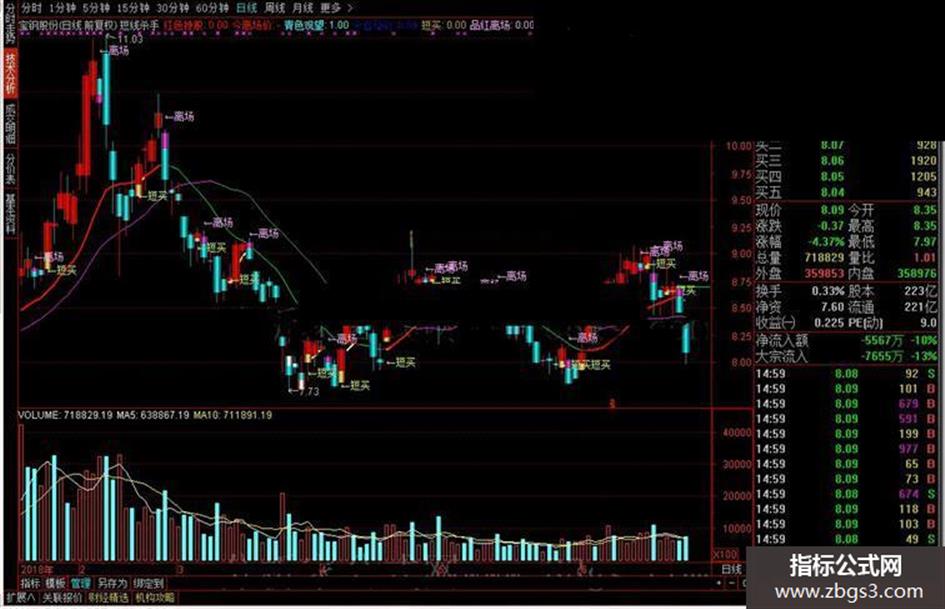 JRH:=HHV(C,2); JRL:=LLV(C,2); MA3:=MA(CLOSE,3); YTSL:=(3*CLOSE+LOW+OPEN+HIGH)/6; VAR1:=(CLOSE>REF(CLOSE,1) AND CLOSE>REF(CLOSE,2)); VAR2:=(REF(VAR1,1) AND CLOSE<=REF(CLOSE,1) AND CLOSE>=REF(CLOSE,2)); VAR3:=(REF(VAR2,1) AND CLOSE>=REF(CLOSE,1) AND CLOSE<=REF(CLOSE,2)); VAR4:=(REF(VAR3,1) AND CLOSE<=REF(CLOSE,1) AND CLOSE>=REF(CLOSE,2)); VAR5:=(REF(VAR4,1) AND CLOSE>=REF(CLOSE,1) AND CLOSE<=REF(CLOSE,2)); VAR6:=(REF(VAR5,1) AND CLOSE<=REF(CLOSE,1) AND CLOSE>=REF(CLOSE,2)); VAR7:=(REF(VAR6,1) AND CLOSE>=REF(CLOSE,1) AND CLOSE<=REF(CLOSE,2)); VAR8:=(REF(VAR7,1) AND CLOSE<=REF(CLOSE,1) AND CLOSE>=REF(CLOSE,2)); VAR9:=(REF(VAR8,1) AND CLOSE>=REF(CLOSE,1) AND CLOSE<=REF(CLOSE,2)); VARA:=(REF(VAR9,1) AND CLOSE<=REF(CLOSE,1) AND CLOSE>=REF(CLOSE,2)); VARB:=(REF(VARA,1) AND CLOSE>=REF(CLOSE,1) AND CLOSE<=REF(CLOSE,2)); VARC:=(REF(VARB,1) AND CLOSE<=REF(CLOSE,1) AND CLOSE>=REF(CLOSE,2)); VARD:=(CLOSE=REF(CLOSE,1) AND CLOSE<=REF(CLOSE,2)); VARF:=(REF(VARE,1) AND CLOSE<=REF(CLOSE,1) AND CLOSE>=REF(CLOSE,2)); VAR10:=(REF(VARF,1) AND CLOSE>=REF(CLOSE,1) AND CLOSE<=REF(CLOSE,2)); VAR11:=(REF(VAR10,1) AND CLOSE<=REF(CLOSE,1) AND CLOSE>=REF(CLOSE,2)); VAR12:=(REF(VAR11,1) AND CLOSE>=REF(CLOSE,1) AND CLOSE<=REF(CLOSE,2)); VAR13:=(REF(VAR12,1) AND CLOSE<=REF(CLOSE,1) AND CLOSE>=REF(CLOSE,2)); VAR14:=(REF(VAR13,1) AND CLOSE>=REF(CLOSE,1) AND CLOSE<=REF(CLOSE,2)); VAR15:=(REF(VAR14,1) AND CLOSE<=REF(CLOSE,1) AND CLOSE>=REF(CLOSE,2)); VAR16:=(REF(VAR15,1) AND CLOSE>=REF(CLOSE,1) AND CLOSE<=REF(CLOSE,2)); VAR17:=(REF(VAR16,1) AND CLOSE<=REF(CLOSE,1) AND CLOSE>=REF(CLOSE,2)); VAR18:=(REF(VAR17,1) AND CLOSE>=REF(CLOSE,1) AND CLOSE<=REF(CLOSE,2)); VAR19:=((REF(VARD OR VARE OR VARF OR VAR10 OR VAR11 OR VAR12 OR VAR13 OR VAR14 OR VAR15 OR VAR16 OR VAR17 OR VAR18,1)) AND VAR1); VAR1A:=((REF(VAR1 OR VAR2 OR VAR3 OR VAR4 OR VAR5 OR VAR6 OR VAR7 OR VAR8 OR VAR9 OR VARA OR VARB OR VARC,1)) AND VARD); 红色持股:VAR1 OR VAR2 OR VAR3 OR VAR4 OR VAR5 OR VAR6 OR VAR7 OR VAR8 OR VAR9 OR VARA OR VARB OR VARC,COLOR0000FF,NODRAW; 离场:=IF(红色持股,JRL,DRAWNULL); 明离场价:=离场,COLORFF99FF,NODRAW; 今离场价:REF(离场,1)COLOR0000FF,NODRAW; 青色观望:VARD OR VARE OR VARF OR VAR10 OR VAR11 OR VAR12 OR VAR13 OR VAR14 OR VAR15 OR VAR16 OR VAR17 OR VAR18,COLORFFFF00,NODRAW; 进:=IF(青色观望,JRH,DRAWNULL); 明进场价:=进,COLOR33AACC,NODRAW; 今进场价:REF(明进场价,1),COLORFF0000,NODRAW; 短买:VAR19,COLOR33AACC,NODRAW; 品红离场:VAR1A,COLORFF99FF,NODRAW; 急速超跌:(CLOSE-MA(CLOSE,34))/MA(CLOSE,34)*100<-14,COLORFFFFFF,NODRAW; 上市日期年:REF(YEAR,BARSCOUNT(CLOSE)-1),NODRAW,COLOR0000FF; 月:REF(MONTH,BARSCOUNT(CLOSE)-1),NODRAW,COLORFF00FF; 日:REF(DAY,BARSCOUNT(CLOSE)-1),NODRAW,COLOR00FFFF; 辰星线:(20*YTSL+19*REF(YTSL,1)+18*REF(YTSL,2)+17*REF(YTSL,3)+16*REF(YTSL,4)+15*REF(YTSL,5)+14*REF(YTSL,6)+13*REF(YTSL,7)+12*REF(YTSL,8)+11*REF(YTSL,9)+10*REF(YTSL,10)+9*REF(YTSL,11)+8*REF(YTSL,12)+7*REF(YTSL,13)+6*REF(YTSL,14)+5*REF(YTSL,15)+4*REF(YTSL,16)+3*REF(YTSL,17)+2*REF(YTSL,18)+REF(YTSL,20))/211,COLOR0000FF; 牵牛线:MA(CLOSE,26),COLORFF00FF; 等待:=IF(MA3>辰星线,辰星线,MA3); IF(等待>REF(等待,1),等待,DRAWNULL),LINETHICK2,COLOR00FFFF; IF(辰星线>REF(辰星线,1),辰星线,DRAWNULL),LINETHICK2,COLOR0000FF; IF(辰星线REF(牵牛线,1),牵牛线,DRAWNULL),LINETHICK1,COLORFF00FF; IF(牵牛线=O,L,H,0,0),COLOR0000CC; STICKLINE(C=O,C,O,3.5,0),COLOR0000E5; STICKLINE(红色持股,CLOSE,O,2.8,0),COLOR000055; STICKLINE(红色持股,CLOSE,O,2,0),COLOR000088; STICKLINE(红色持股,CLOSE,O,1.5,0),COLOR0000AA; STICKLINE(红色持股,CLOSE,O,1,0),COLOR0000CC; STICKLINE(红色持股,CLOSE,O,0.5,0),COLOR0000EE; STICKLINE(青色观望,CLOSE,O,2.8,0),COLOR555500; STICKLINE(青色观望,CLOSE,O,2,0),COLOR888800; STICKLINE(青色观望,CLOSE,O,1.5,0),COLORAAAA00; STICKLINE(青色观望,CLOSE,O,1,0),COLORCCCC00; STICKLINE(青色观望,CLOSE,O,0.5,0),COLOREEEE00; CO:=(C-O); STICKLINE(急速超跌,O,C-CO/2,2.8,0),COLOR555555; STICKLINE(急速超跌,O,C-CO/2,2,0),COLOR888888; STICKLINE(急速超跌,O,C-CO/2,1.5,0),COLORAAAAAA; STICKLINE(急速超跌,O,C-CO/2,1,0),COLORCCCCCC; STICKLINE(急速超跌,O,C-CO/2,0.5,0),COLOREEEEEE; STICKLINE(短买,O,O+CO/3,2.8,0),COLOR335555; STICKLINE(短买,O,O+CO/3,2,0),COLOR338888; STICKLINE(短买,O,O+CO/3,1.5,0),COLOR33AAAA; STICKLINE(短买,O,O+CO/3,1,0),COLOR33CCCC; STICKLINE(短买,O,O+CO/3,0,0),COLOR33EEEE; DRAWTEXT(短买,REF(CLOSE,1),'←短买'),COLOR33FFCC; STICKLINE(品红离场,O,O+CO/3,2.8,0),COLOR550055; STICKLINE(品红离场,O,O+CO/3,2,0),COLOR880088; STICKLINE(品红离场,O,O+CO/3,1.5,0),COLORAA00AA; STICKLINE(品红离场,O,O+CO/3,1,0),COLORCC00CC; STICKLINE(品红离场,O,O+CO/3,0.5,0),COLOREE00EE; DRAWTEXT(品红离场,REF(CLOSE,1)+0.1,'←离场'),COLORFF99FF;