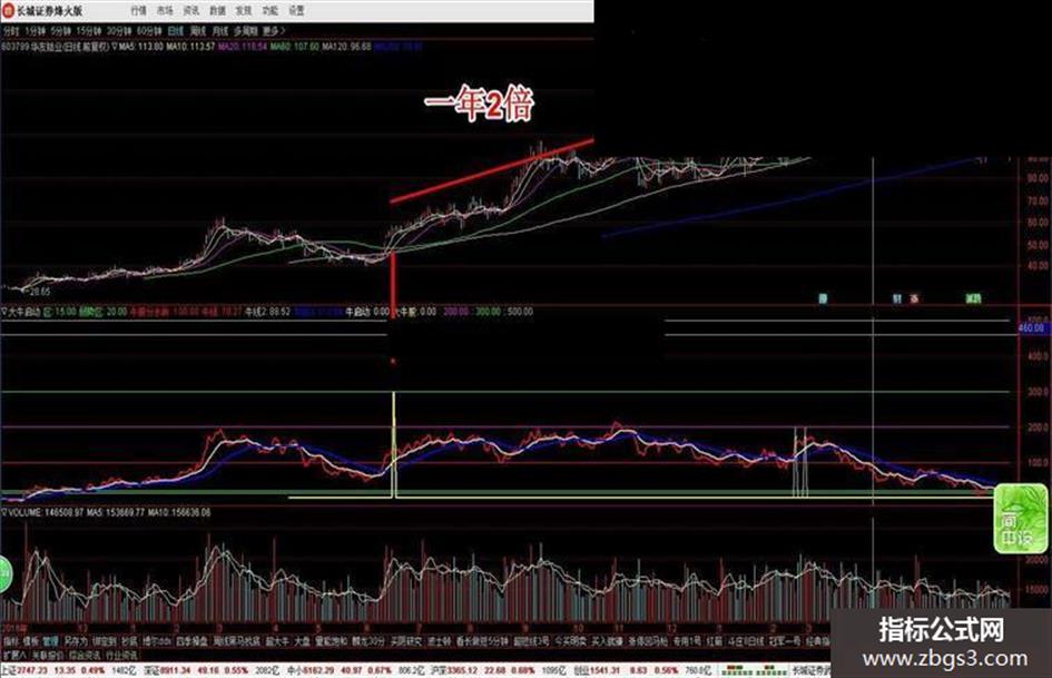 大牛股:((MA1>MA2 AND MA2>MA3 AND CROSS(牛线2,100)) OR (MA1>MA2 AND CROSS(牛线2,200)) )*300,LINETHICK2;
