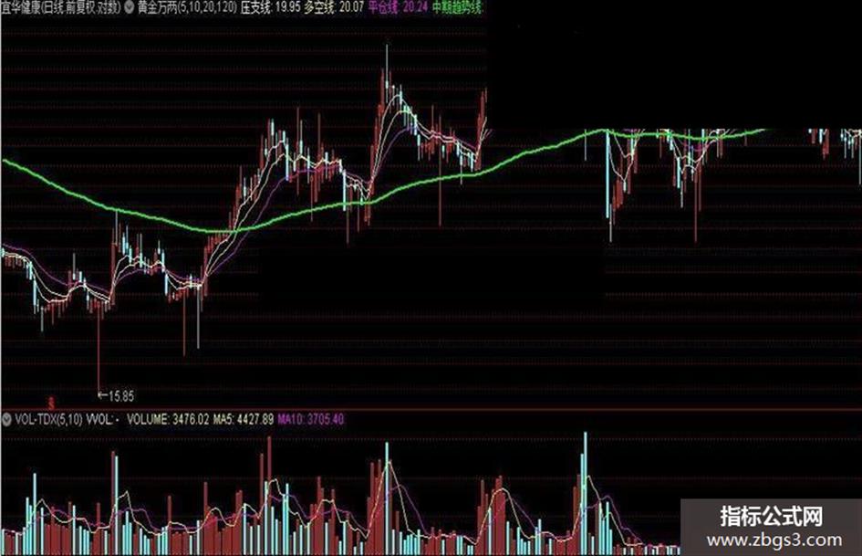 压支线:EXPMA(CLOSE,M1); 多空线:EXPMA(CLOSE,M2); 平仓线:EXPMA(CLOSE,M3); 中期趋势线:EXPMA(CLOSE,M4)LINETHICK2;