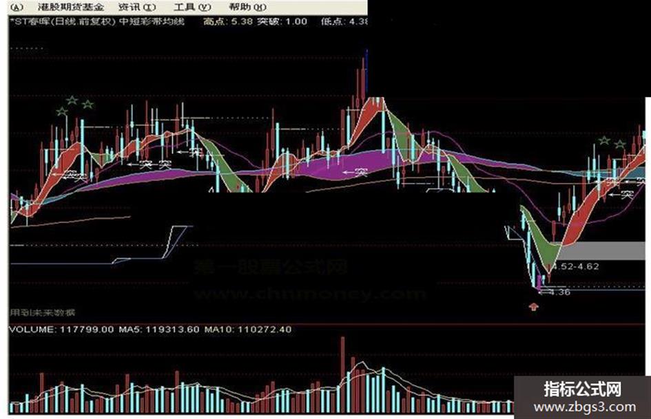 DRAWBAND(MA(CLOSE,5),RGB(170,50,50),MA(CLOSE,10),RGB(83,123,68));{短涨跌彩带}