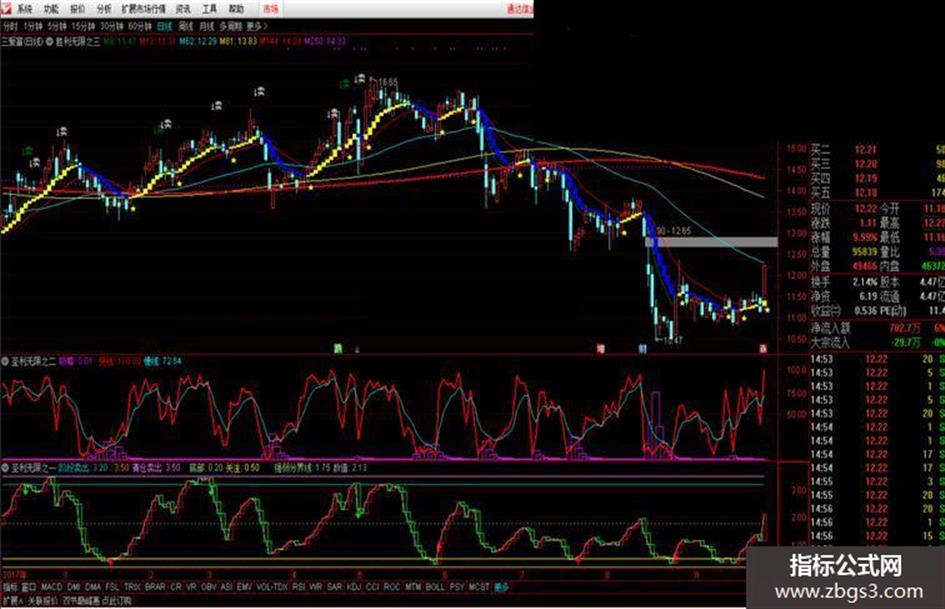 主图加两个副图指标。只做主图黄色上升趋势的票,顺势而为。结合副图,副图1指标,底部出现的红箭头产生买点,股价上涨到清仓线最近注意风险,安全第一