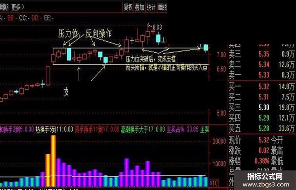 “T十0”之K线买卖方法一。在某个时间段成交量最大的这根K线的最高最低价就有压力或者支撑,股价回调到该K线会获得支撑,反之股价反弹到该K线会有压力,当股价处于该K线之间上有压力下有支撑。压力位就做反向操作,支撑位就做正向操作。