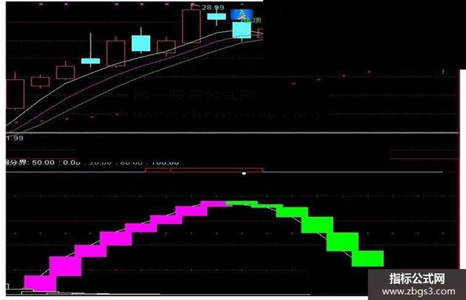 VAR1:=(HHV(HIGH,9)-CLOSE)/(HHV(HIGH,9)-LLV(LOW,9))*100-70; VAR2:=SMA(VAR1,9,1)+100; VAR3:=(CLOSE-LLV(LOW,9))/(HHV(HIGH,9)-LLV(LOW,9))*100; VAR4:=SMA(VAR3,3,1); VAR5:=SMA(VAR4,3,1)+100; VAR6:=VAR5-VAR2; 趋势: IF(VAR6>45,VAR6-45,0); STICKLINE(REF(趋势,1)< 趋势, 趋势,REF(趋势,1),5,0),colorff00ff; STICKLINE(REF(趋势,1)> 趋势, 趋势,REF(趋势,1),5,0),color00ff00; 强弱分界:50,POINTDOT,Colorffffcc; 0,Color00Ffff; 20,POINTDOT,COlORFFAA66,linethick1; 80,POINTDOT,COlORFFAA66,linethick1; 100,Colorffff33; v1:=llv(low,10); v2:=hhv(h,25); 价位线:=ema((c-v1)/(v2-v1)*4,4); DRAWTEXT(CROSS(价位线,0.3),7,'●'),ColorFFFfff; DRAWTEXT(CROSS(3.5,价位线),102,'●'),ColorFFFfff; Var2q:=REF(LOW,1); Var3q:=SMA(ABS(LOW-Var2q),3,1)/SMA(MAX(LOW-Var2q,0),3,1)*100; Var4q:=EMA(IF(CLOSE*1.3,Var3q*10,Var3q/10),3); Var5q:=LLV(LOW,30); Var6q:=HHV(Var4q,30); Var7q:=IF(MA(CLOSE,58),1,0); Var8q:=EMA(IF(LOW<=Var5q,(Var4q+Var6q*2)/2,0),3)/618*Var7q; Var9q:=IF(Var8q>100,100,Var8q); 吸筹:STICKLINE(Var9q>-120,0,Var9q,6,1),coloryellow; AA3:=(HHV(HIGH,21)-CLOSE)/(HHV(HIGH,21)-LLV(LOW,21))*100-10; AA4:=(CLOSE-LLV(LOW,21))/(HHV(HIGH,21)-LLV(LOW,21))*100; AA5:=SMA(AA4,13,8); 走势:=CEILING(SMA(AA5,13,8)); AA6:=SMA(AA3,21,8); 卖临界:STICKLINE(走势-AA6>85,103,100,15,1),Color0000ff,linethick2;