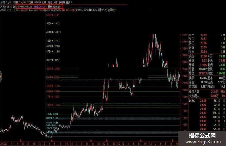 【目标预测】 是13年分享的指标, 加入一组可以调节的黄金分割线, 升级后更加直观看到支撑和压力位置。