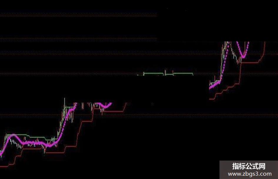 趋势:EMA(SLOPE(CLOSE,21)*20+CLOSE,42),POINTDOT,COLORMAGENTA,LINETHICK4; 压力:MA(REF(HHV(CLOSE,30),1),2),COLORGREEN; 支撑:MA(REF(LLV(CLOSE,30),1),2),COLORRED;