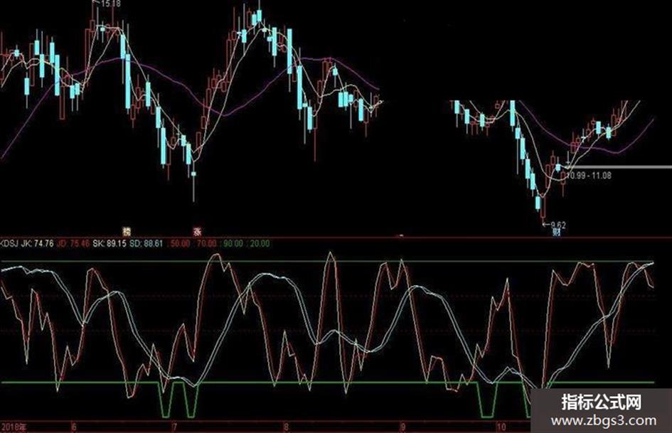 该指标是前段时间在微信群听老师讲课时,老师无私分享的指标,用了一段时间感觉非常好用,今天分享给各位,希望各位股市长红!! 简单用法:20以下金叉买入最佳,70以上分批卖出,80以上清仓。 激进买点JK上穿JD时买入; 稳妥买点SK上穿SD时买入; 最佳买点 当日JK上穿JD并且SK上穿SD时买入;