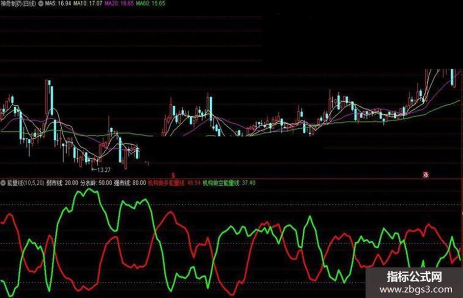 弱市线:20,POINTDOT; 分水岭:50,POINTDOT; 强市线:80,POINTDOT; 机构做多能量线:SMA((CLOSE-LLV(LOW ,9) )/(HHV(HIGH,9)-LLV(LOW,9))*100,5,1)-8,colorred,LINETHICK3; 机构做空能量线:SMA((HHV(HIGH,36)-CLOSE)/(HHV(HIGH,36)-LLV(LOW,36))*100,2,1),colorgreen,LINETHICK3;