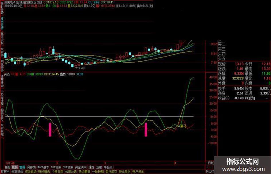 1:黄线大于绿线基本都是短线底部,k线往上走势,出现黑马的位置如果出现大幅上涨拉升,量能放大现象,牛股就在眼前;