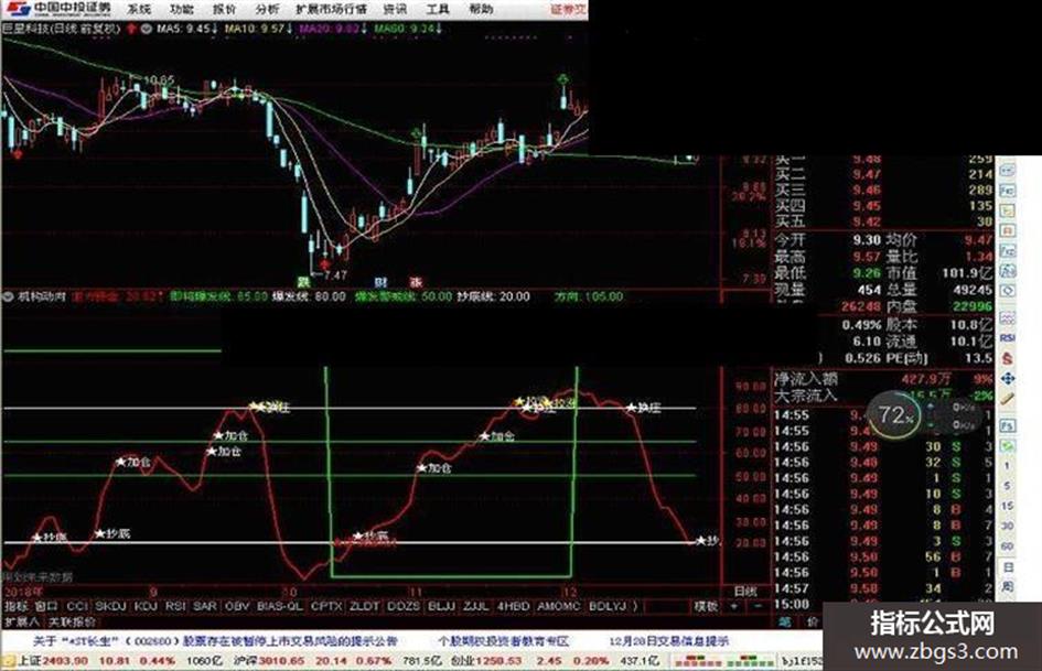 DRAWTEXT(CROSS(主力资金,警戒线) AND 方向 < 50,主力资金,'★关注') ,COLORWHITE;