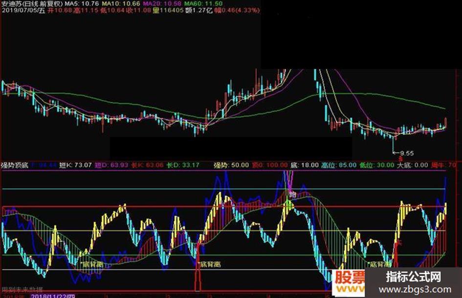 底背离:=REF(CLOSE,A1+1)>CLOSE AND 短K>REF(短K,A1+1) AND CROSS(短K,短D);