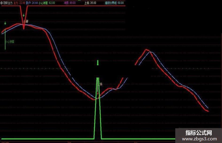 小心被套:IF(CROSS(主力,75) AND 散户<主力,75,62),STICK,LINETHICK2,COLORGREEN;62,STICK,LINETHICK2,COLOR000000;