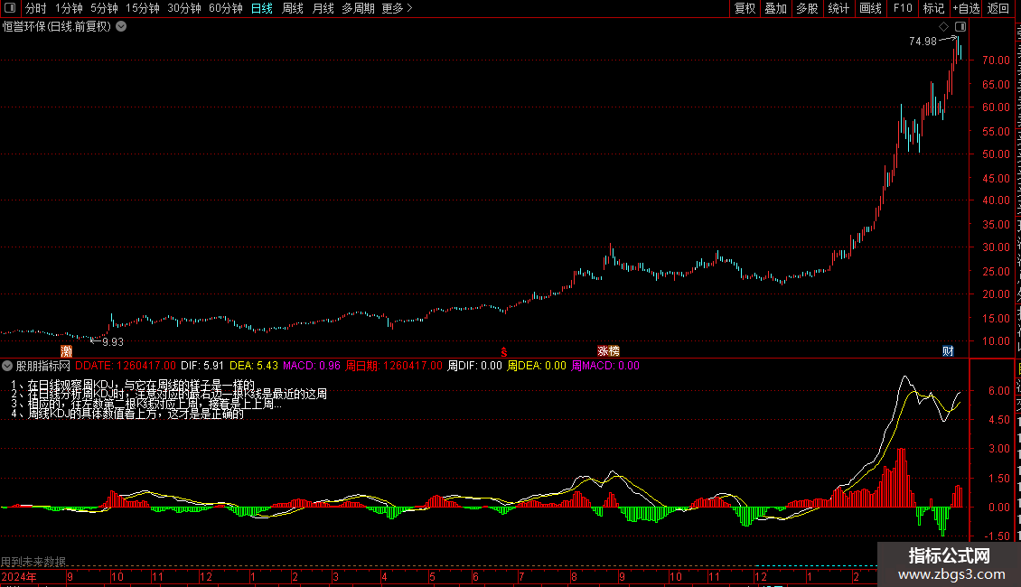 KDJ和MACD是我们经常用到的公式,特别是它们在周线下的形态我们会特别关注,因此免不了经常在日周两个周期内切换。本公式免去了这种切换的麻烦,同时又不像有些周线公式日显时需要不断缩小才能窥见全貌。