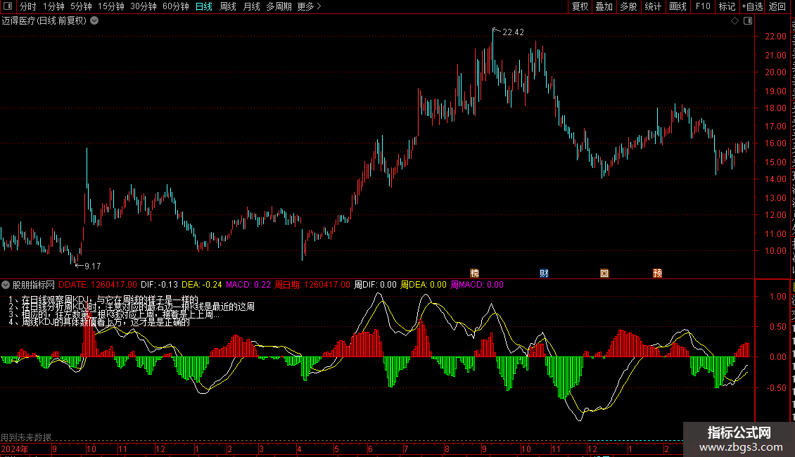 DRAWTEXT_FIX(1,0.01,0.16,0,'4、周线MACD的具体数值看上方,这才是是正确的'),COLORWHITE;