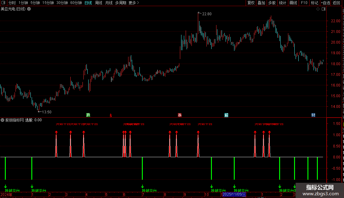 DRAWTEXT(突破低,-1.5,'跌破平台'),COLORGREEN;