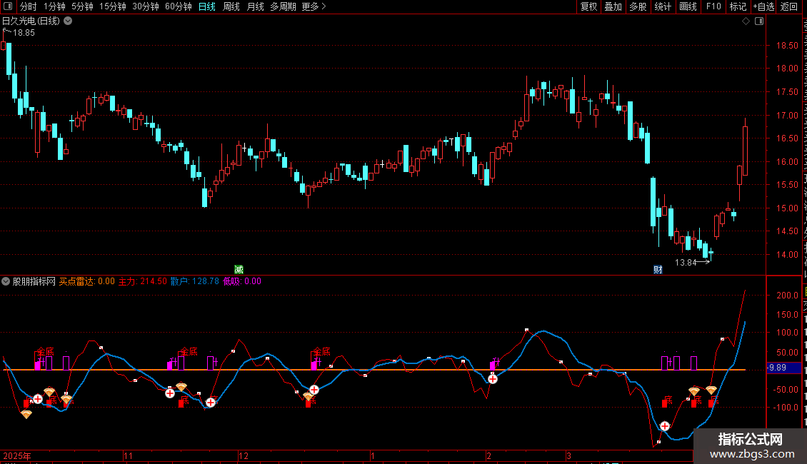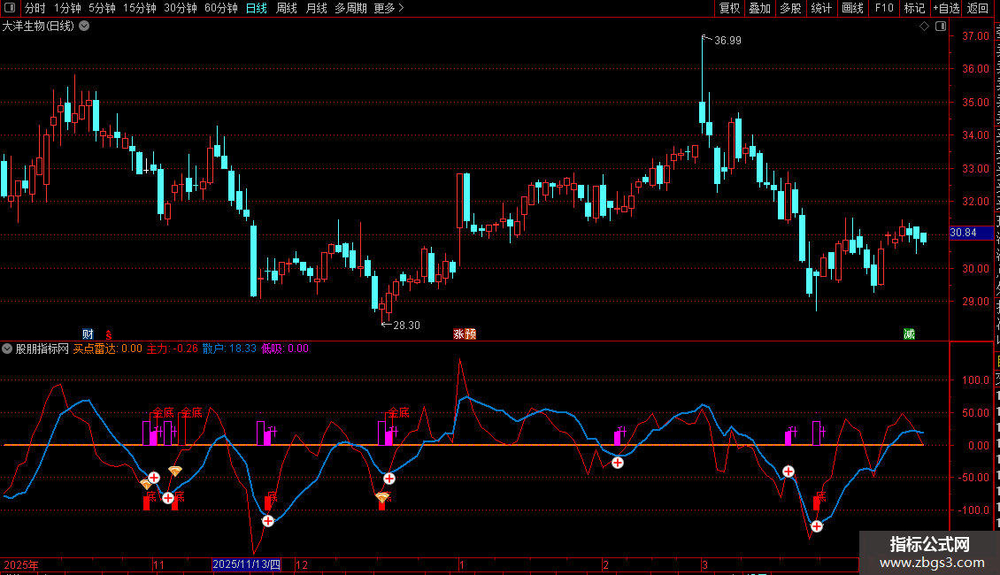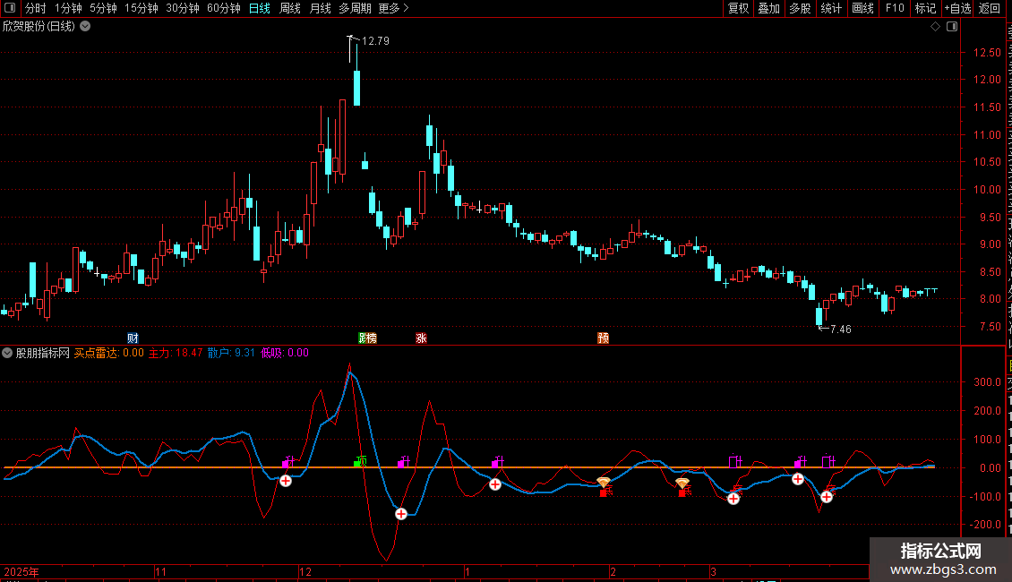 买点雷达:(VARB< 20 AND VARC< 25 AND VARD> 50 AND AR<70)*30,LINETHICK2,COLOR0078FF;