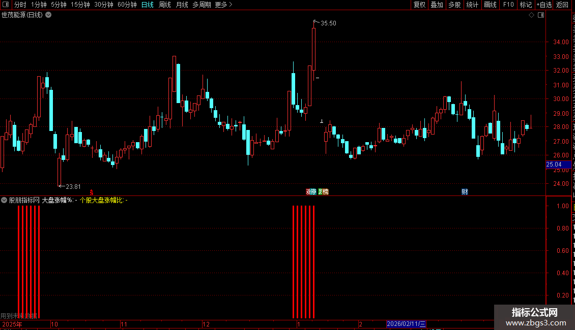 STICKLINE(INDEXC>0,0,IF(大盘涨幅%<=0,大盘涨幅%/10,DRAWNULL),3,0),COLORGREEN;