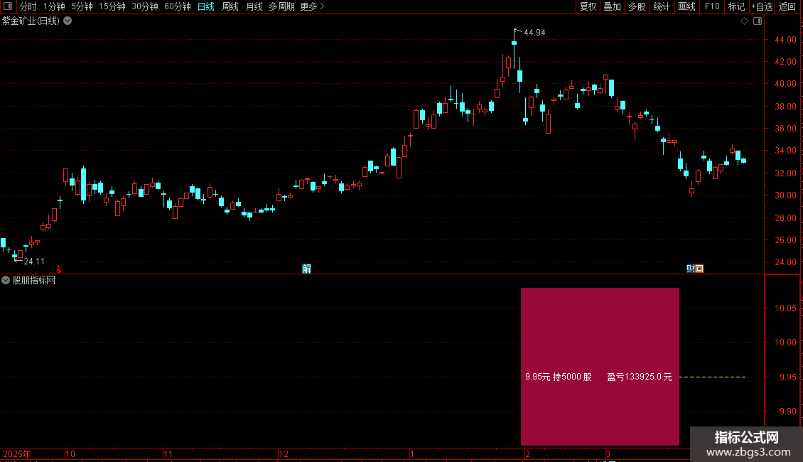 股4成本:= 6.125;股4数量:= 5000;股4现价:="601899$C";股4:='601899';
