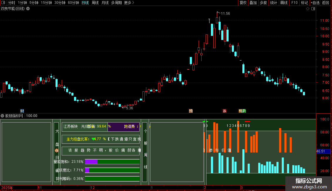 DRAWTEXT_FIX(1,0.265,0.61,1,STRCAT(STRCAT('量能饱和:',CON2STR(量能饱和,2)),'%')),COLORWHITE;
