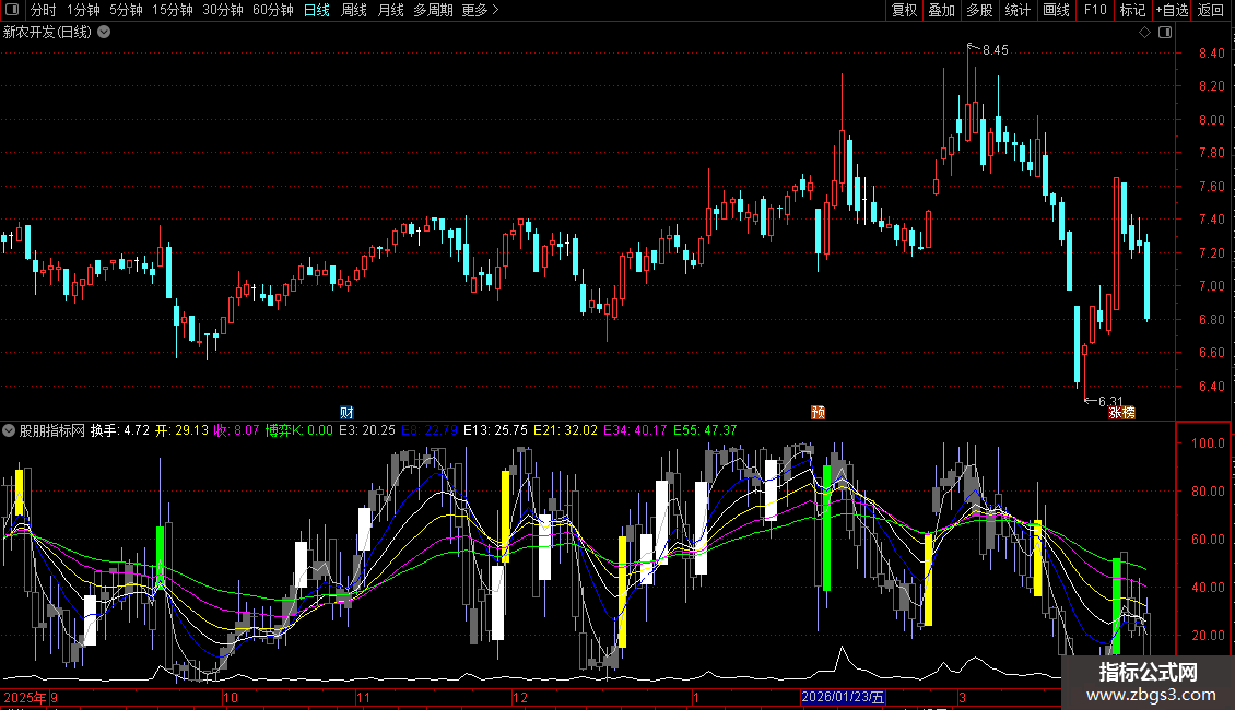 这个指标分为几个部分,一、表示换手率的,底下那根白色曲线。二、加权均线,就是那几根并列在一起的彩色线条。三、重点:博奕K线,由红 黄 白 绿 灰 阴阳K线组成。这个指标很直观,大红阳代表这个K线振幅较大,换手也较大。其它三色黄绿白代表力度依次减弱,灰色才是代表下降趋势,总的来说,这个指标更适用振荡行情,对于趋势行情使用上会不太准。这个指标也可以表示为获利筹码,但表达的范围不太大,当初是和筹码指标一起使用的,大家可以结合通达信自带的筹码指标一起判断。这个指标在判断顶部区域的的效果较好,底部判断较差(我个人一般不抄底)。
