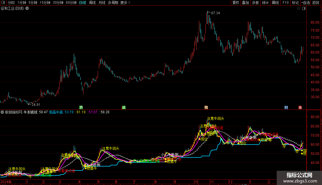 牛本钱线:EMA(X,13),COLORWHITE,DOTLINE;