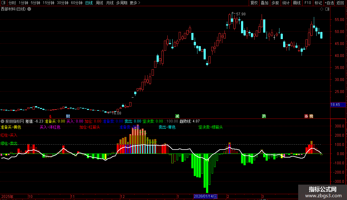 准备卖:IF(差值>60 AND VB>0 AND 中期>50,4,0),COLORBLUE;