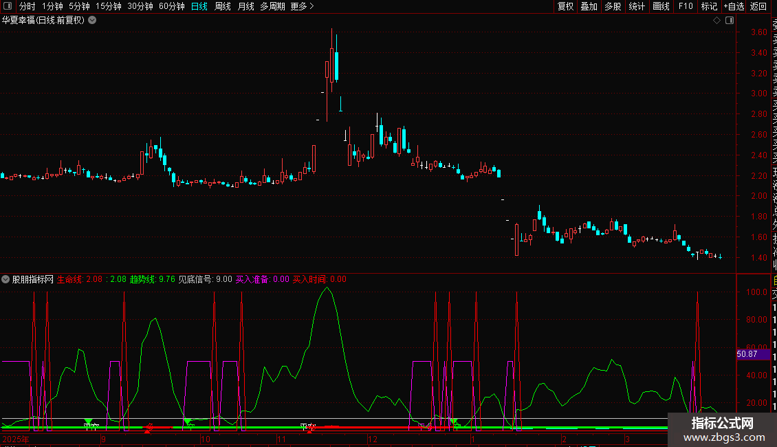 生命线:EMA(MA(C,66),60),LINETHICK2,COLORRED;