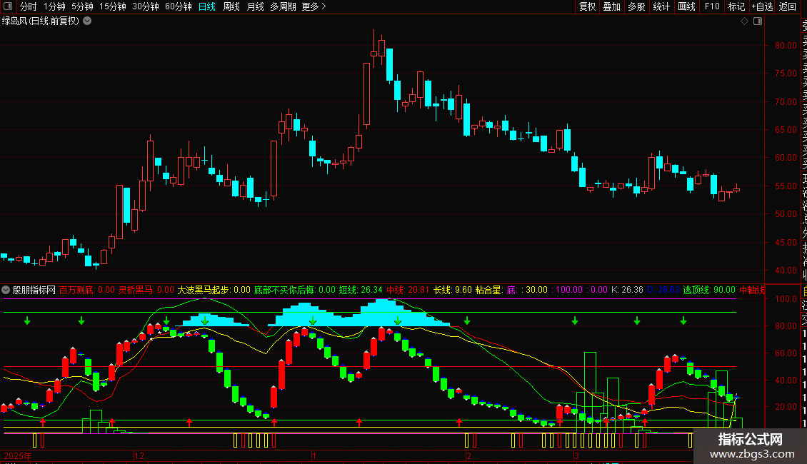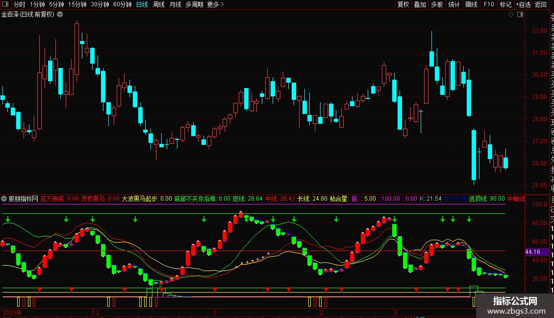 底:DRAWTEXT(CROSS(中线2,-90) AND (长线<中线 AND 长线>REF(长线,1)OR 短线<20 AND 中线<20 AND 长线<20),长线,'底'),COLORFF00FF;