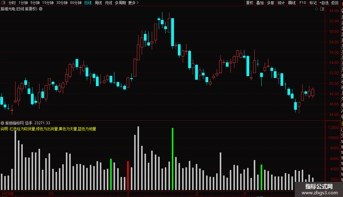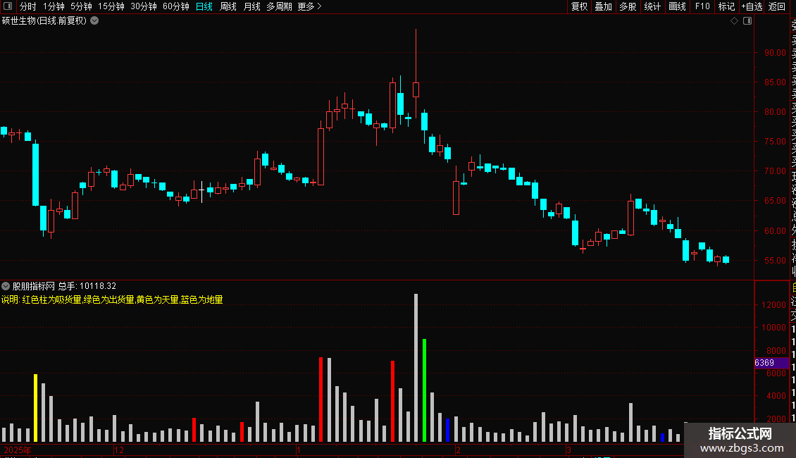 DRAWTEXT_FIX(ISLASTBAR,0,0,0,'说明: 红色柱为吸货量,绿色为出货量,黄色为天量,蓝色为地量'),COLORYELLOW;