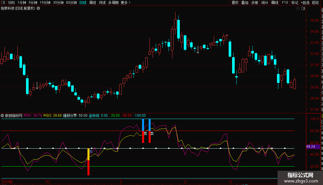 RSI双色柱买卖指标(副图 通达信 截图)红橙双色柱买,红蓝双色柱卖源码下载: