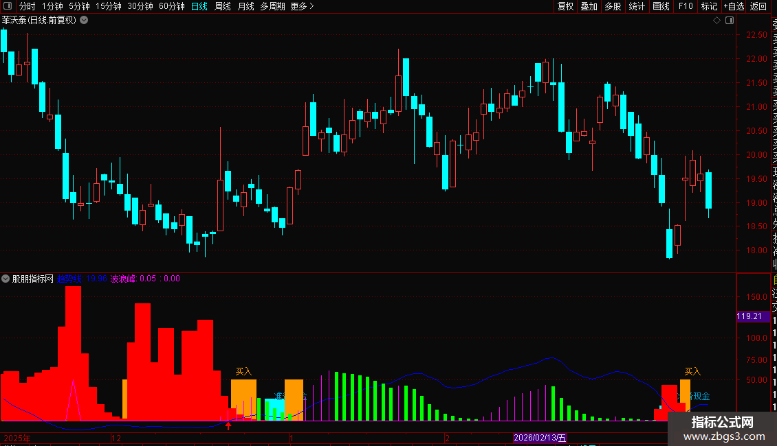 出现红色或者橙色柱子是买入点,蓝色趋势线冲上顶后出现白色块是卖出信号!