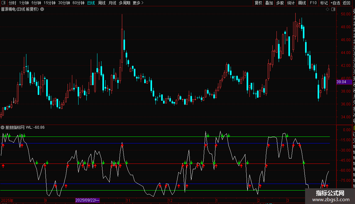 用法:WL上穿-80为波段买点,WL下穿-10为波段卖点,WL在-80和-50区间运行为弱势区域,WL在-50和-20区间运行为强势区域。
