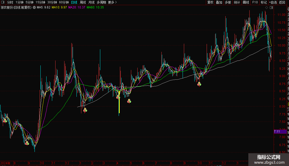 STICKLINE((CLOSE-REF(CLOSE,1))/REF(CLOSE,1)*100>9.5,CLOSE,OPEN,1.5,0),COLORYELLOW;