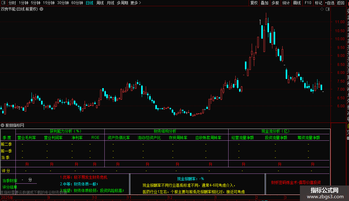 DRAWTEXT_FIX(ISLASTBAR,0.18,N1*8,0,'2.中等:财务体质一般;'),COLORCYAN;
