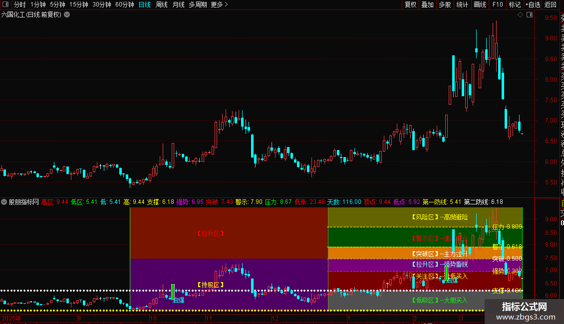 DRAWTEXT(CURRBARSCOUNT=N/4+5,GD-KJ*0.09,'【风险区】--高抛避险'),COLOR00FFFF;