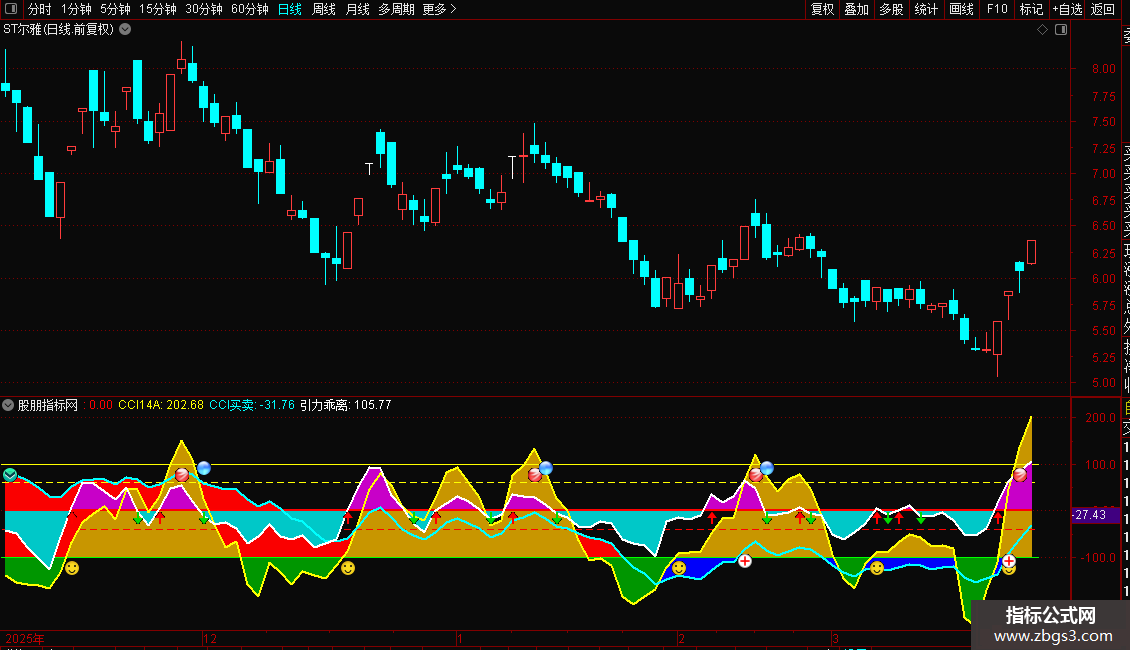 CCI14:=(TYP-MA(TYP,14))/(0.015*AVEDEV(TYP,14)),COLOR00FFFF,LINETHICK2;